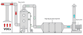 Tháp hấp phụ sử dụng vật liệu có khả năng hấp phụ cao như than hoạt tính để giữ lại các hợp chất độc hại trong khí thải.