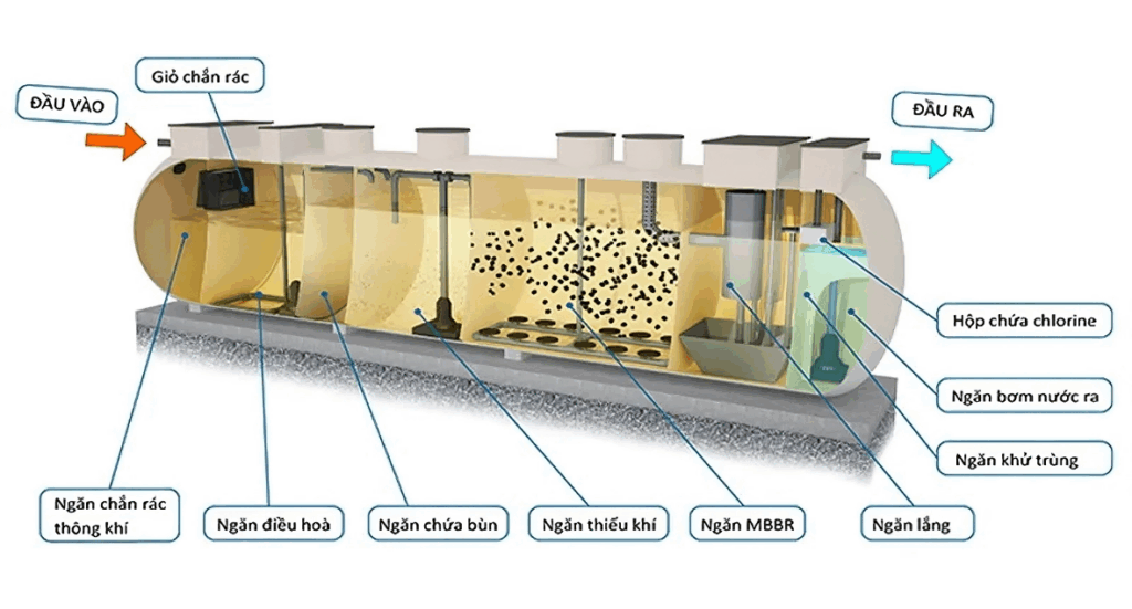 Bồn composite xử lý nước thải hoạt động theo nguyên tắc xử lý sinh học kết hợp cơ học, được chia thành nhiều ngăn chức năng liên tiếp trong cùng một bồn kín.